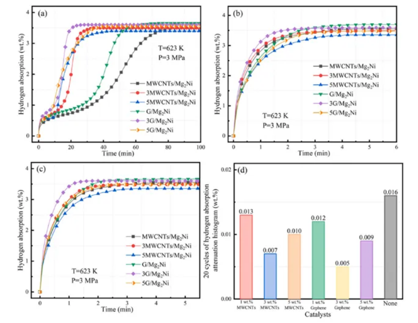 當(dāng)添加量為3wt%時表現(xiàn)出最佳的吸氫性能,在475K的溫度下,在200s內(nèi)迅速達到吸氫的飽和狀態(tài),在達到吸收溫度后表現(xiàn)出穩(wěn)健的吸氫動力學(xué)。隨著5wt%MWCNTs的引入,放氫飽和溫度為545K,放氫速率也略有上升。與MWCNTs樣品相比,3G/Mg2Ni在476K左右表現(xiàn)出更冷的吸氫量,具有更強的動力學(xué)特性,可以在150s內(nèi)快速達到吸氫飽和。