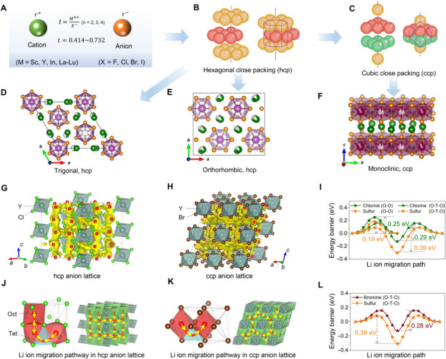 (A)正負(fù)離子晶體半徑比;(B)鹵素離子的六方密排結(jié)構(gòu);(C)鹵素離子的立方密排結(jié)構(gòu);(D)含hcp陰離子排列的三角晶體結(jié)構(gòu)(Pm1);(E)含hcp陰離子排列的正交晶體結(jié)構(gòu)(Pnma);(F)含ccp陰離子排列的單斜晶體結(jié)構(gòu)(C2/m);(G)Li3YCl6(類似hcp的陰離子晶格)和(H)Li3YBr6(類似cp的陰離子晶格)的晶體結(jié)構(gòu)。黃色標(biāo)記為AIMD模擬得到的Li+概率密度;(I)在hcp亞晶格中單個Li+遷移的能量分布圖;(J)Li3YCl6中Li+的遷移路徑;(K)Li3YBr6中Li+的遷移路徑;(L)ccp亞晶格中單個Li+遷移的能量分布圖。