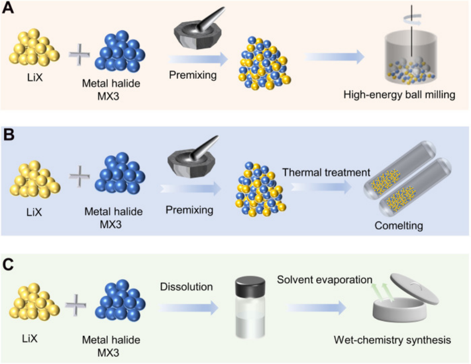 目前,當(dāng)前鹵化物固態(tài)電解質(zhì)的合成主要采用機(jī)械混合球磨和高溫?zé)Y(jié)路徑,采用其他的合成方法,如液相合成、氣相沉積等,報道的相對較少。