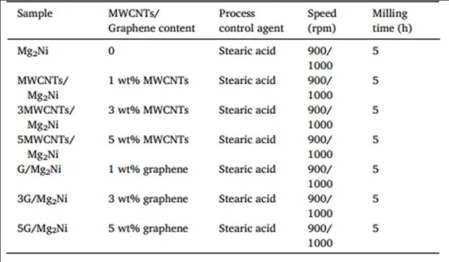 首先稱取45.3g鎂粉、54.7g鎳粉和3g硬脂酸(用作過程控制劑)。為了平衡Mg在球磨過程中的損失,額外添加4wt %Mg,然后均勻混合并放入高能球磨機中。為了防止球磨過程中的氧化,在氬氣保護氣氛下進行了研磨。球料比為151,采用3mm不銹鋼球,球磨機以900r/min1000r/min的速度交替運行,研磨時間為5h。在球磨過程中使用循環(huán)冷卻方式,使球磨腔溫度維持在35℃左右。使用石墨烯和MWCNTsMg2Ni合金進行復(fù)合改性。
