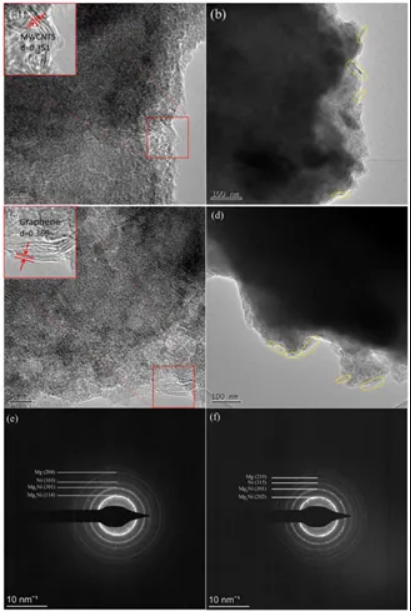 圖4 不同放大倍數(shù)下MWCNTs與石墨烯復(fù)合材料的TEM圖像:(a)-(b)3MWCNTs/Mg2Ni,(c)-(d)3G/Mg2Ni,(e)-(f)3MWCNTs/Mg2Ni的SAED