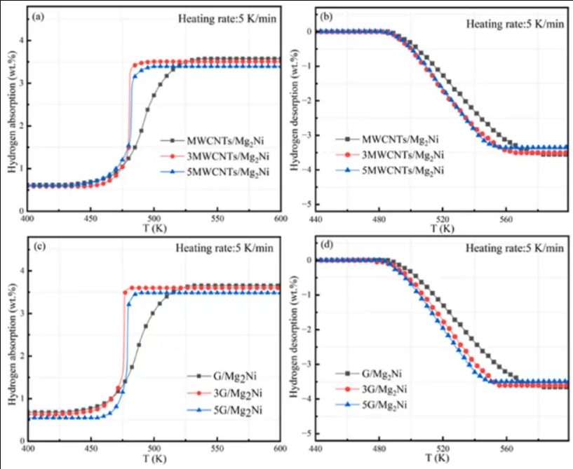 當(dāng)添加量為3wt%時表現(xiàn)出最佳的吸氫性能,在475K的溫度下,在200s內(nèi)迅速達到吸氫的飽和狀態(tài),在達到吸收溫度后表現(xiàn)出穩(wěn)健的吸氫動力學(xué)。隨著5wt%MWCNTs的引入,放氫飽和溫度為545K,放氫速率也略有上升。與MWCNTs樣品相比,3G/Mg2Ni476K左右表現(xiàn)出更冷的吸氫量,具有更強的動力學(xué)特性,可以在150s內(nèi)快速達到吸氫飽和。